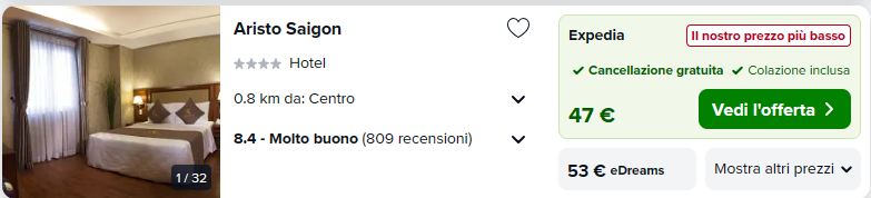 Una volta atterrati ad Ho Chi Minh potreste prendere in considerazione l’ottima struttura a 4 stelle Hotel Aristo Saigon a €47/notte per camera doppia con colazione inclusa.