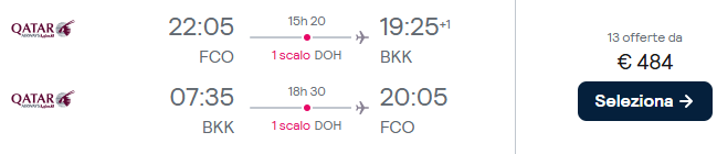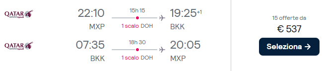 La compagnia n.1 al mondo, Qatar Airways sta offrendo ottime tariffe per volare in Thailandia nel periodo migliore! Prenota il tuo volo da Malpensa a Bangkok da soli €484 a/r.