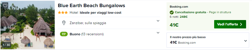 Durante il vostro viaggio a Zanzibar, potreste prendere in considerazione un soggiorno presso questa ottima struttura sulla spiaggia: Blue Earth Beach Bungalows. Potrete prenotare un bungalow per due a soli €41 a notte!