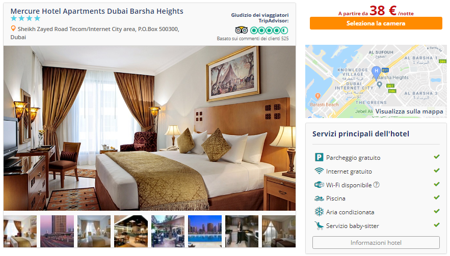 Una volta fatto, vi ritroverete su questa pagina dove potrete procedere alla prenotazione del vostro soggiorno presso l’eccellente Mercure Hotel Apartments Dubai Barsha Heights a soli €38/notte per camera doppia!