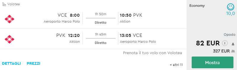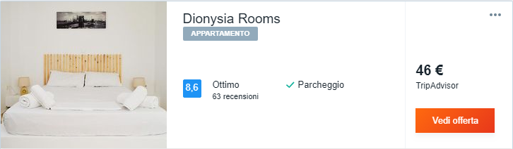 Abbiamo creato per voi una combinazione volo + hotel, per 3 persone, da soli €175 a testa! La settimana presa in considerazione è quella dal 19 al 26 Luglio, con voli Venezia-Preveza da €82 a/r. Per il pernotto, suggeriamo il buon appartamento Dionysia Rooms, con buone recensioni ed un prezzo di soli €46 a notte per camera doppia (ovvero 322 complessivi da dividere in 3). Il prezzo finale sarà quindi di €175 a testa!