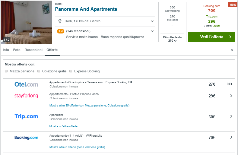 Sfruttando una tariffa inusuale per la tratta Palermo – Rodi nel periodo estivo, ti proponiamo questa combinazione fai da te di volo + hotel per 4 persone, in date 12-19 Giugno, ad un costo assolutamente eccezionale! Il costo a testa di €117 comprende il prezzo del volo di €71 e del pernotto, presso la struttura Panorama And Apartments di soli €46.75 a testa.