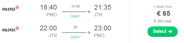 Sfruttando le interessanti tariffe Volotea, ti proponiamo questa combinazione di volo + pernotto per 4 persone, con partenze da Palermo ad un costo assolutamente eccezionale! Il prezzo comprende il costo del volo e del soggiorno presso la struttura  Blue Island Perissa, a soli €55/notte per camera quadrupla grazie allo sconto del 30% trovato! Il prezzo totale a persona di €161 è dato dalla somma del costo del volo, €65, e del pernotto di €96.25 per 7 notti. Segui i link per procedere alla prenotazione!