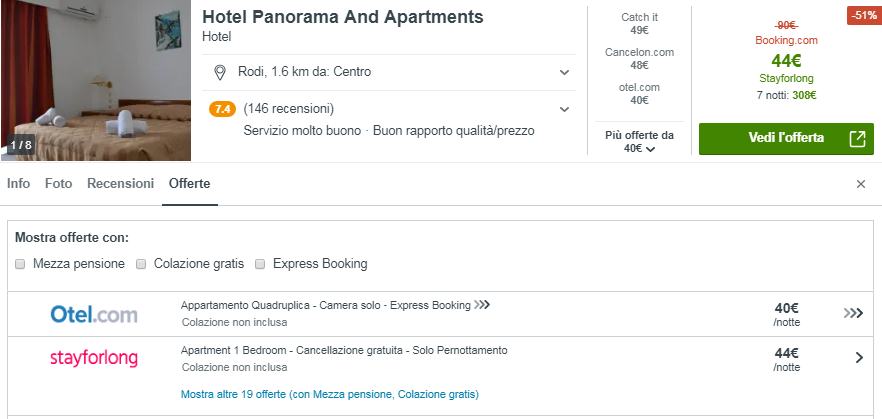 Sfruttando una tariffa conveniente sulla tratta Catania – Rodi nel periodo estivo, ti proponiamo questa combinazione fai da te di volo + hotel per 4 persone, in date 13-20 Luglio, ad un costo assolutamente eccezionale! Il costo a testa di €139 comprende il prezzo del volo di €62 e del pernotto, presso la struttura Panorama And Apartments di soli €70 a testa per 7 notti.