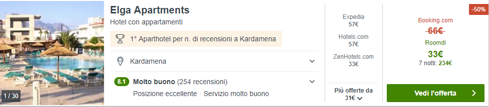Proponiamo un pacchetto per 4 persone, con voli dal 21 al 28 Settembre da Roma Fiumicino e soggiorno presso un appartamento dell’ottima struttura Elga Apartments, valutata 4/5 su Tripadvisor ed a soli a soli 250 metri dalla spiaggia. Il volo costa €90 a/r a testa, mentre l’appartamento ha un costo di €33 a notte (€231 complessivi), ovvero solo €8,25/notte a testa, grazie allo sconto del 50% trovato!