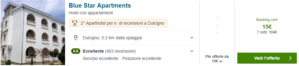 Blue Star Apartments con ottime recensioni su Booking (9,2/10). Questa struttura è situata a Ulcinj (Dulcigno), a soli 600 metri dalla spiaggia ed offre camere e appartamenti climatizzati con balcone arredato e l’accesso allo splendido giardino con area solarium.