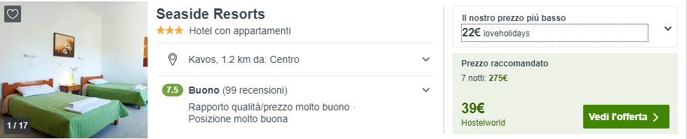 Il prezzo totale di €160 a testa mostrato come esempio è dato dalla somma del costo del volo (€83 a/r) e del pernotto presso una buona struttura con piscina, il Seaside Resort, al prezzo di soli €22 a notte per un monolocale da 2 persone, ovvero €77 a testa per 7 notti! La struttura vanta buone recensioni su Tripadvisor: 3,5/5!