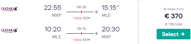 Splendida occasione per un bel viaggio alle Maldive! Con €757 a testa potrai volare con la compagnia n.1 al mondo, Qatar Airways, e soggiornare 7 notti in un fantastico resort a 5 stelle nell’atollo di Baa con mezza pensione inclusa! Nota: da aggiungere a questo prezzo il costo dei trasferimenti Male – Baa a/r pari a €250 a passeggero come indicato dall’hotel.