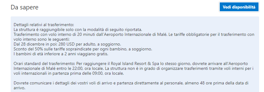 Info importante sui transfers: l’atollo di Baa sorge a 35 minuti di trasporto (volo interno +traghetto) dall’Aeroporto Internazionale di Malé, per il quale la struttura organizza un servizio di trasferimento obbligatorio, da pagare al momento dell’arrivo. (si prega di contattare la struttura per i dettagli su questo servizio)