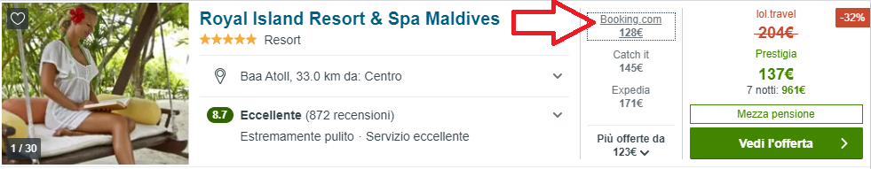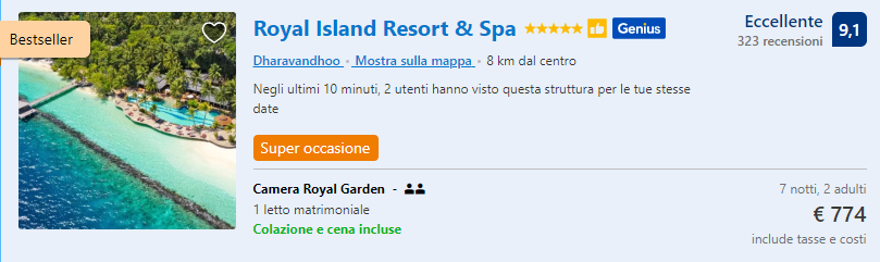 Proponiamo un pacchetto fai da te per 2 persone per una vacanza di lusso alle Maldive! Il prezzo campione di €757 a testa è dato dalla somma del costo del volo Qatar Airways da Milano (€370 a/r a testa), nella settimana 4-12 Maggio (arrivo il 5) e del pernotto presso l’ottima struttura a 5 stelle Royal Island Resort & Spa, situato nel pacifico atollo di Baa, a “soli” €110/notte per una camera royal garden con colazione e cena incluse (ovvero €774 complessivi per 7 notti, €387 a testa)!