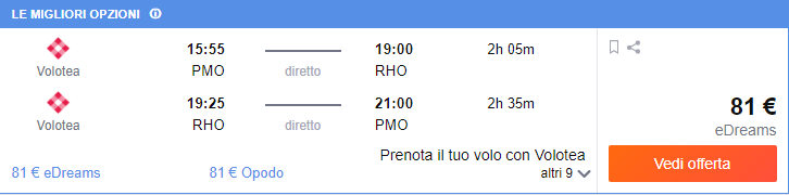 Sfruttando una tariffa inusuale per la tratta Palermo – Rodi nel periodo estivo, ti proponiamo questa combinazione fai da te di volo + hotel per 2 persone, in date 4-11 Luglio, ad un prezzo assolutamente eccezionale! Il prezzo comprende il costo del volo di €81 a testa e del pernotto, presso la struttura Panorama Studios ,di soli €80,5 a testa.