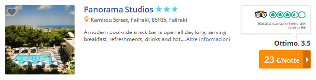 Soggiorna presso il Panorama Studios  con buone recensioni su Tripadvisor (3,5/5). Situato su una collina verde, questa struttura offre una vista panoramica sulla spiaggia di Faliraki, una piscina per bambini e una piscina, con bar, corredata di un’ampia terrazza con lettini e ombrelloni. I monolocali comprendono un bagno con doccia, un angolo cottura attrezzato, un frigorifero e l’aria condizionata. Clicca qui per prenotare o clicca sull’immagine seguente: