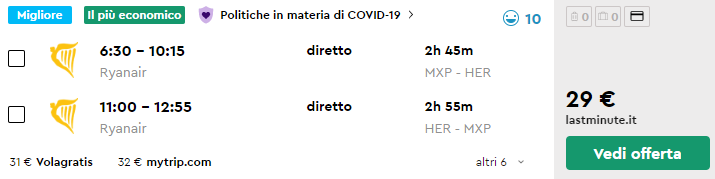 Il prezzo minimo di €117 a testa è dato dalla somma del costo del volo, €29, e del pernotto, €88,5 (€354/4), nel caso di una prenotazione da 4 persone.