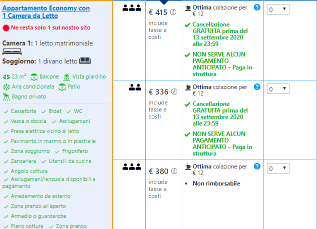 Come mostrato nella foto sotto, al costo di €54/notte (non rimborsabile, ovvero €18/notte a testa) potrete prenotare un appartamento per 3 persone con una camera da letto e divano letto; la cancellazione gratuita sarà invece inclusa a partire da €59/notte.