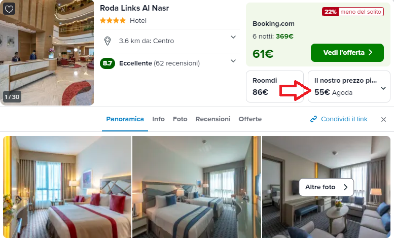 Abbiamo costruito per voi questo pacchetto volo + hotel per 2 ospiti molto conveniente! Il prezzo finale di €369 a testa, indicato nel titolo, è dato dalla somma fra il costo del volo da Malpensa, €204 a testa, e delle 6 notti presso il Roda Links Al Nasr, €165 a testa ( €55 x 6 = €330).