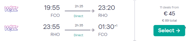 L’esempio con partenza da Roma Fiumicino per 2 ospiti prevede un costo minimo di €206 complessivi a testa con voli dal 5 al 12 Luglio e pernotto presso il Garden Hotel Pastida Rhodes.