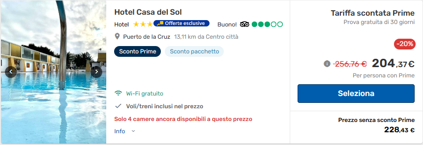 Istruzioni per prenotare: dopo aver cliccato sui link in alto evidenziati in azzurro, selezionare i filtri “Prezzo” e “hotel 3 stelle” per ordinare i risultati di ricerca a partire dal più economico; il pacchetto indicato sarà il primo risultato in lista.
