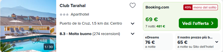 Trascorri una settimana nell’isola spagnola di Tenerife grazie a questo pacchetto, costruito per 4 (o 3 o 2) persone, con partenza da Milano Malpensa, Bergamo Orio al Serio, Roma Fiumicino, Treviso, Bologna e Napoli! L’offerta prevede un soggiorno di 7 notti presso l’ottima struttura Club Tarahal al costo complessivo di €183,75 a testa dato dalla somma del costo del volo di €70 andata e ritorno (tariffa minima da MXP) e del pernotto di €113,75 a testa (€455/4).
