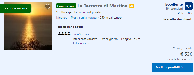 Come mostrato sopra, il prezzo minimo è di €75/notte, ovvero €132,5 a testa per 7 notti nel caso di una prenotazione da 4 persone; se vorrete prenotare per 3 o 2 ospiti basterà modificare il numero di adulti dopo aver cliccato.