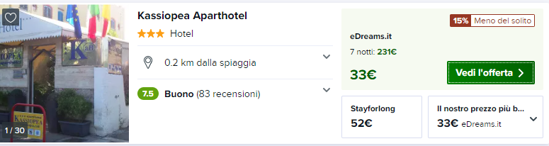 Come mostrato sopra, il costo minimo nel periodo indicato è di €33/notte per una camera doppia, ovvero €115 a testa per una vacanza da 7 notti.
