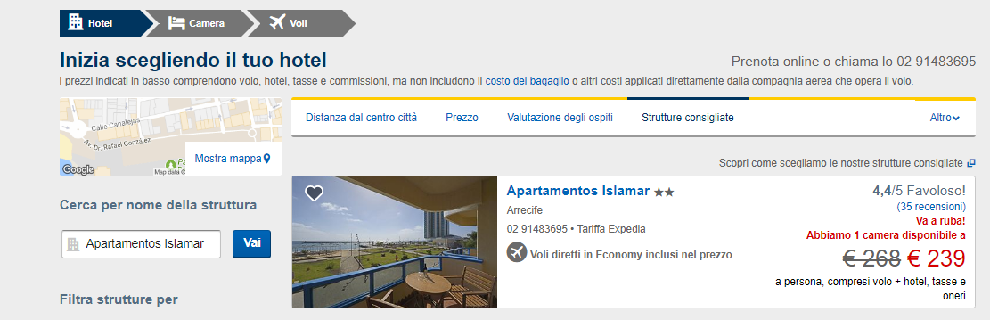 Cosa se dici? Se sei convinto di voler trascorrere le tue vacanze a Lanzarote, qui ti spieghiamo come procedere alla prenotazione: clicca qui e ti ritroverai nella homepage di Expedia. Seleziona l’aeroporto di partenza e le date indicate (14-21 Giugno) per ottenere le tariffe più convenienti, nonché la voce “Volo+Hotel”. Fatto cio’, nella pagina che si aprirà di conseguenza, scrivi o incolla il nome dell’hotel, Apartamentos Islamar, nel campo “Cerca per nome della struttura” come mostrato in figura ed il gioco sarà fatto!