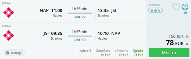 Questa volta proponiamo un pacchetto per 2 persone nell’isola di Skiathos al costo di soli €188, con voli dal 6 al 13 Giugno da Napoli. La struttura selezionata è il Fengeros Village con ottime recensioni su Tripadvisor (4/5) e con camere doppie a soli €31/notte. Il prezzo complessivo di €188 a testa è dato dalla somma tra il costo del volo di €78 e del pernotto di €108,5 per 7 notti.