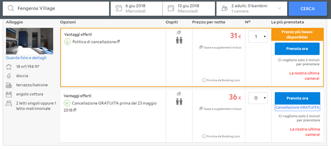 Sei pronto a prenotare la tua settimana a Skiathos? Ti spieghiamo come procedere alla prenotazione! Clicca qui, Fengeros Village sarà il primo risultato nella lista di ricerca. Clicca per selezionarlo ed in seguito verrai reindirizzato e vedrai questa schermata, dalla quale potrai procedere con la prenotazione: