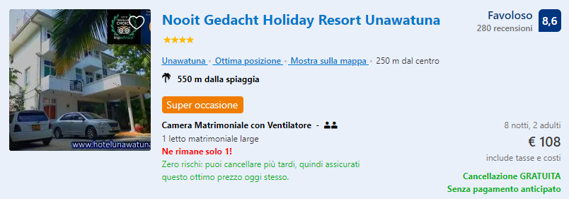La struttura selezionata è il Nooit Gedacht Holiday Resort, a soli 600 metri dalla bellissima e famosa spiaggia di Unawatuna, circondato da una natura rigogliosa e con vista sulla pittoresca montagna Rumassala. Questo hotel dispone di una piscina all’aperto, terrazza esterna con giardino ed una zona pranzo privata dove sarà possibile gustare gli autentici piatti dello Sri Lanka. Tutte le camere includono area soggiorno, zanzariere, vista panoramica sulle montagne e bagno interno completo di set di cortesia e doccia con acqua calda.
