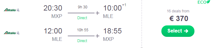 Ottima tariffa per le Maldive sui voli diretti per Malè con partenza da Milano. Scopri il paradiso con soli €370 a/r o €464 a/r da Roma!