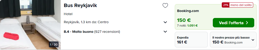 Una volta atterrati a Reykjavik potreste optare per la struttura Bus Reykjavik con ottime recensioni e camere doppie disponibili al prezzi di €150/notte!