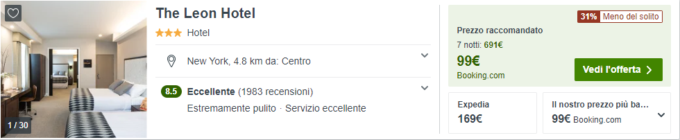 Durante il tuo viaggio a New York, potreste prendere in considerazione il The Leon Hotel, situato a Manhattan e disponibile al costo di €99/notte per camera doppia!