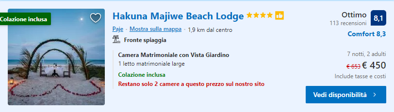 Durante il tuo viaggio a Zanzibar, dovresti prendere in considerazione un soggiorno presso questa ottima struttura 4 stelle sulla spiaggia: Hakuna Majiwe Lodge. Potrai prenotare un bungalow per due a €64 a notte con colazione inclusa!