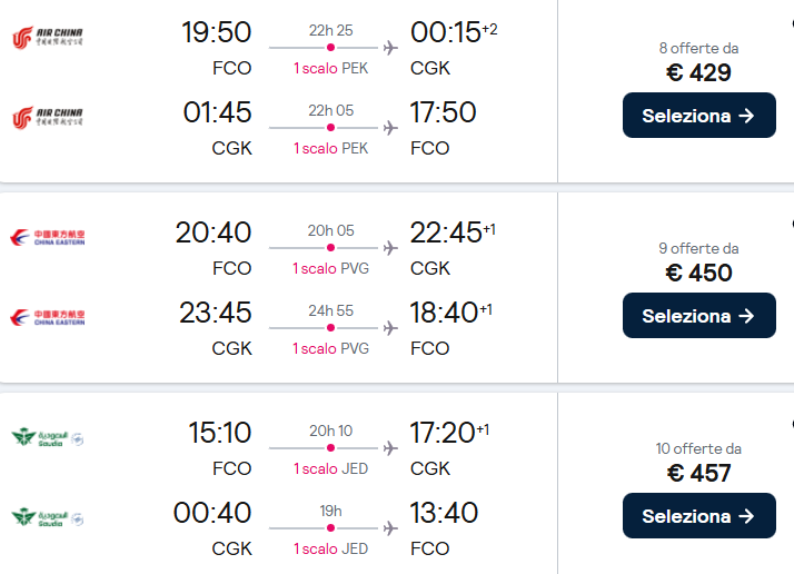 L’Indonesia ti aspetta! Con queste super offerte targate Air China, China Eastern Airlines e Saudia potrai raggiungere Giacarta con dei voli full-service (pasti e bagagli da stiva inclusi) a partire da soli €407 a/r.