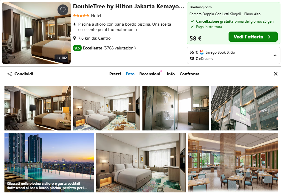 Potreste prendere in considerazione l’ottima struttura a 5 stelle DoubleTree by Hilton Jakarta Kemayoran, fantastico hotel 5 stelle disponibile a soli €55/notte per camera doppia.