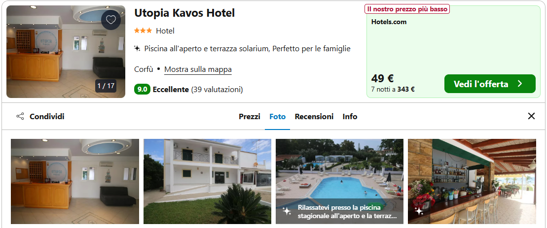 Potreste optare per l’Utopia Kavos Hotel , struttura con piscina e recensioni eccellenti, disponibile a €49/notte per camera doppia.