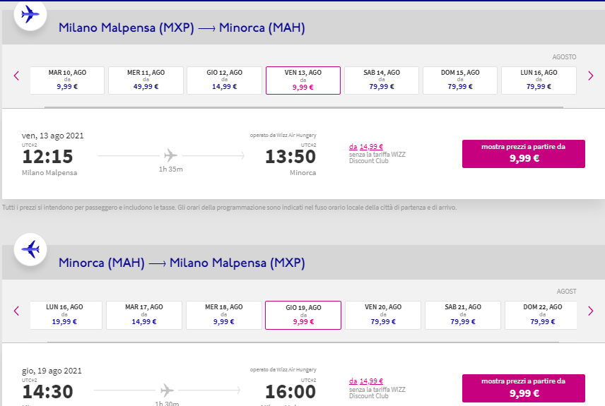 Tariffe low cost Wizzair e Easyjet per volare a Minorca da Milano Malpensa in piena estate a partire da soli €19,98 a/r!