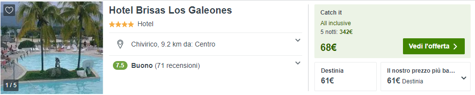 Durante la vostra visita all’isola di Cuba, vorrete coccolarvi in un bel resort? Vi consigliamo la struttura a 4 stelle Brisas Los Galeones, situato di fronte la spiaggia, al costo di €61/notte per camera doppia in formula all-inclusive!