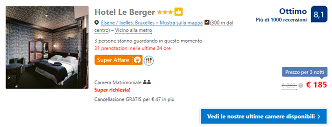 Data la sua buona posizione e le ottime recensioni su  Tripadvisor (4/5), consigliamo l’ Hotel le Berger , nel cuore di Bruxelles, a pochi passi dalla stazione della metropolitana Porte de Namur. Vantando uno stile Art Déco, questa moderna struttura offre WiFi gratuito, un bar e un ristorante di cucina italiana.