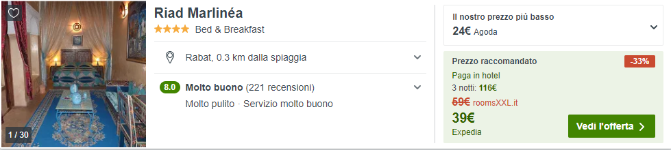 Clicca qui per il pernotto Riad Marlinéa (apri il menu a tendina e seleziona le opzioni a €24/notte)