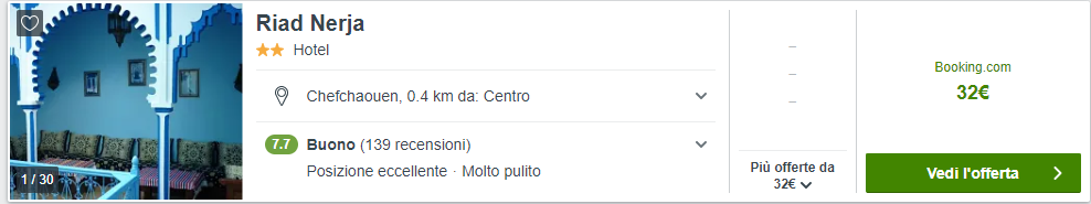 Desideri trascorrere una notte nella pittoresca città blu di Chefchaouen? Consigliamo il Riad Nerja a €32/notte per camera doppia!
