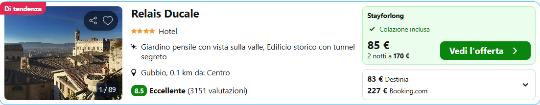 Il  Relais Ducale è situato nella dependance Palazzo Ducale di Gubbio, un edificio di fine 1300, a pochi passi dalla Cattedrale e dal Palazzo dei Consoli nel cuore del centro storico. Questa elegante struttura 4 stelle vanta ottime recensioni (4/5 su Tripadvisor) ed è arredata con mobili d’epoca; inoltre dispone di un giardino pensile, piccole aree salotto, uno snack bar, due sale riunioni e una deliziosa terrazza panoramica dalla quale ammirare Piazza Grande.