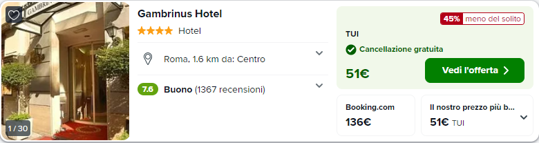 Gambrinus Hotel vanta recensioni ottime su Tripadvisor (4/5) e sorge vicino a Porta Pia. Questo hotel 4 stelle dispone di una reception 24 ore su 24, una sala colazioni e camere eleganti con soffitti a volta e pavimenti in tavertino romano. Esse dispongono di aria condizionata, TV LCD satellitare, bollitore elettrico e bagno privato.