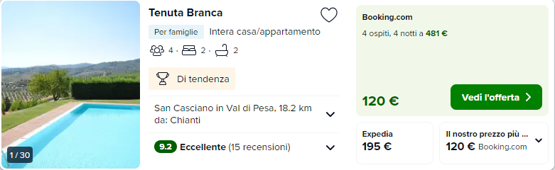 Come mostrato sopra, il prezzo durante il Ponte dell’Immacolata per questa villa di campagna è di €120/notte.