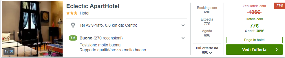 Una volta atterrati a Tel Aviv, potreste soggiornare presso l’Eclectic ApartHotel a €69/notte per camera doppia.
